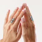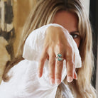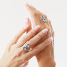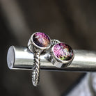 The band’s subtle flexibility allows for a personalised, comfortable fit that gently contours to the wearer’s finger. The dual gem setting creates a balanced focal point, while the twisted silver band adds movement, texture, and sculptural elegance.
