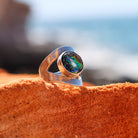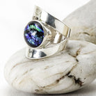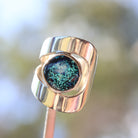 Indulge in the bold elegance of the Wrap Ring, a standout piece renowned for its distinctive design and effortless versatility. At its centre, a mesmerizing dichroic glass gem reflects the breathtaking natural landscapes of Esperance, Western Australia.